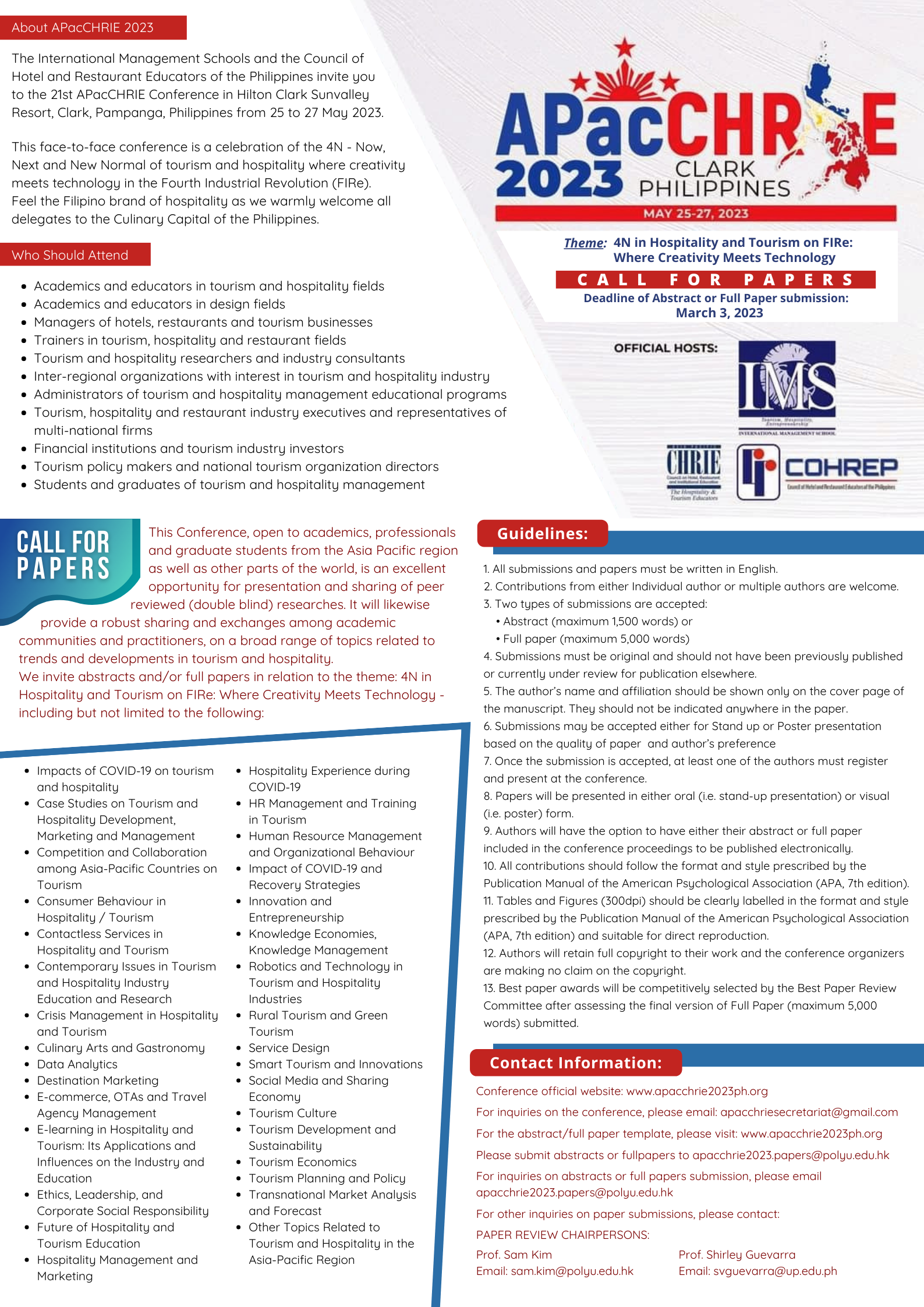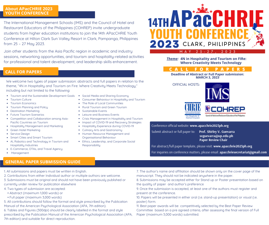 21st APacCHRIE Conference, the14th APacCHRIE Youth Conference and the31st COHREP National Conference will be held face to face at the Clark Global City, Philippines on May 25-27, 2023.
