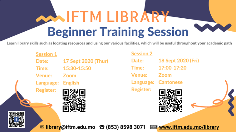 17 & 18 Sep 2020, IFTM Library organised a Beginner Training Session to guide students to acquire library skills such as locating resources and using our various facilities, which will be useful throughout your academic path.