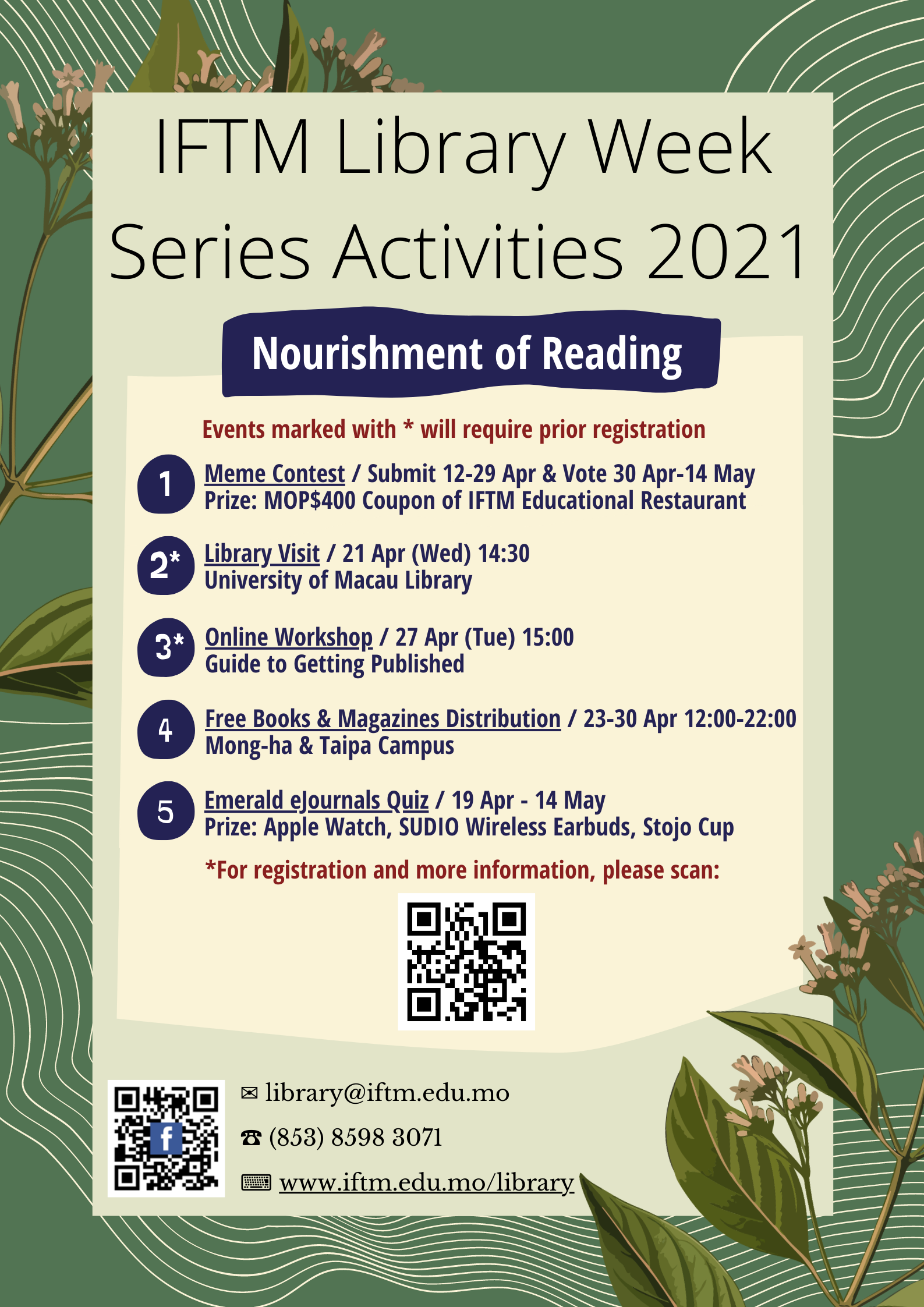 Themed Nourishment of Reading, Macao Library Week 2021 will be held from 12nd April to 16th May. IFTM Library will be hosting 5 events to celebrate and promote the joy of reading: