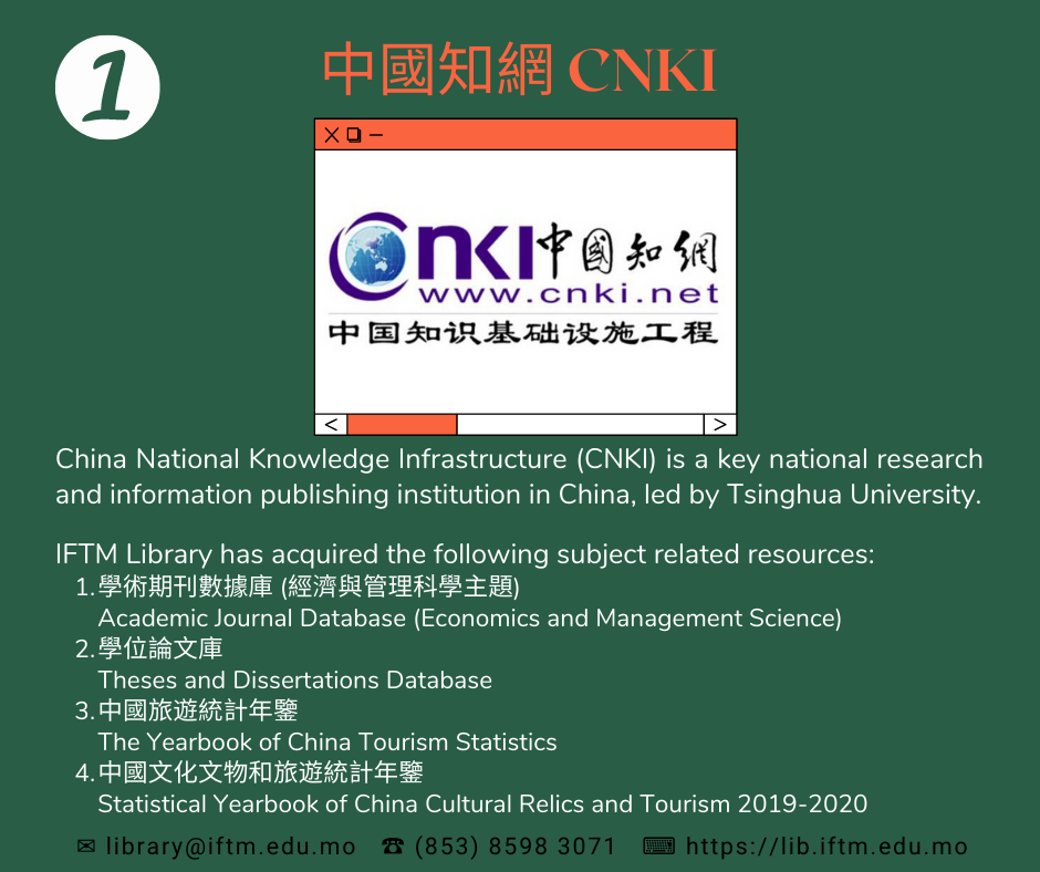 ① China National Knowledge Infrastructure (CNKI) 中國知網 is a key national research and information publishing institution in China, led by Tsinghua University. IFTM Library has acquired the following subject related resources: