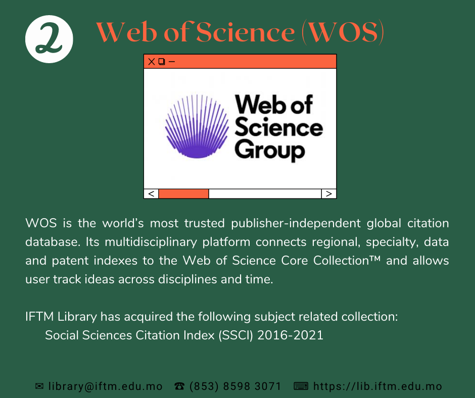 ② Web of Science (WOS) is the world’s most trusted publisher-independent global citation database. Its multidisciplinary platform connects regional, specialty, data and patent indexes to the Web of Science Core Collection™ and allows user track ideas across disciplines and time. IFTM Library has acquired the following subject related collection: Social Sciences Citation Index (SSCI) 2016-2021
