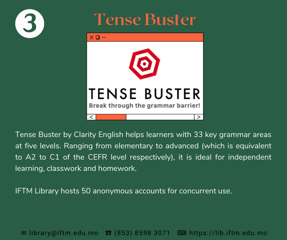 ③ Tense Buster by Clarity English helps learners with 33 key grammar areas at five levels. Ranging from elementary to advanced (which is equivalent to A2 to C1 of the CEFR level respectively), it is ideal for independent learning, classwork and homework. IFTM Library hosts 50 anonymous accounts for concurrent use.
