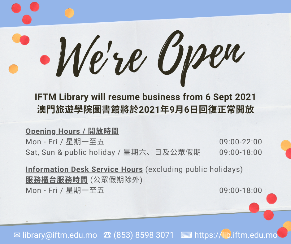 IFTM Library will resume business from 6 Sept 2021. Please remember: