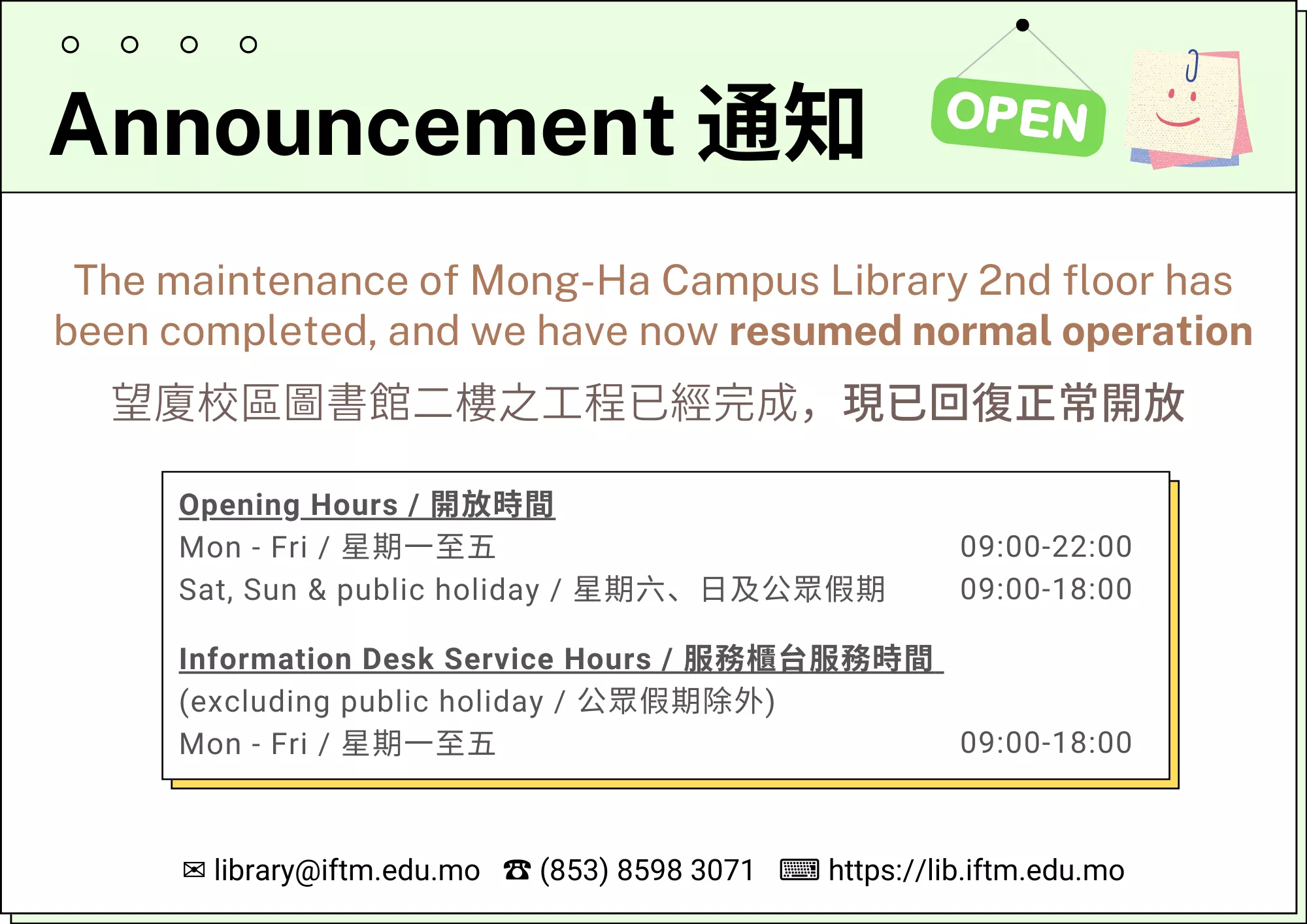 2nd floor of Mong-ha Campus Library Resumed Normal Operation