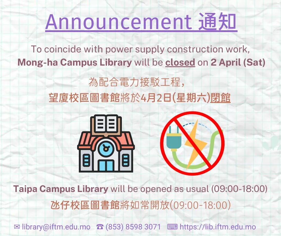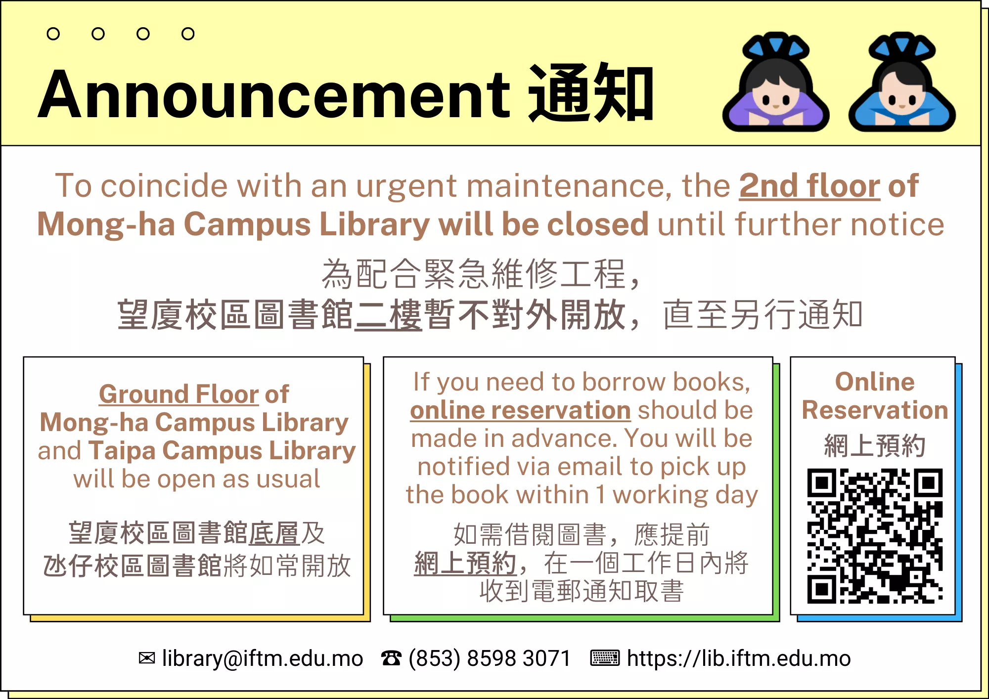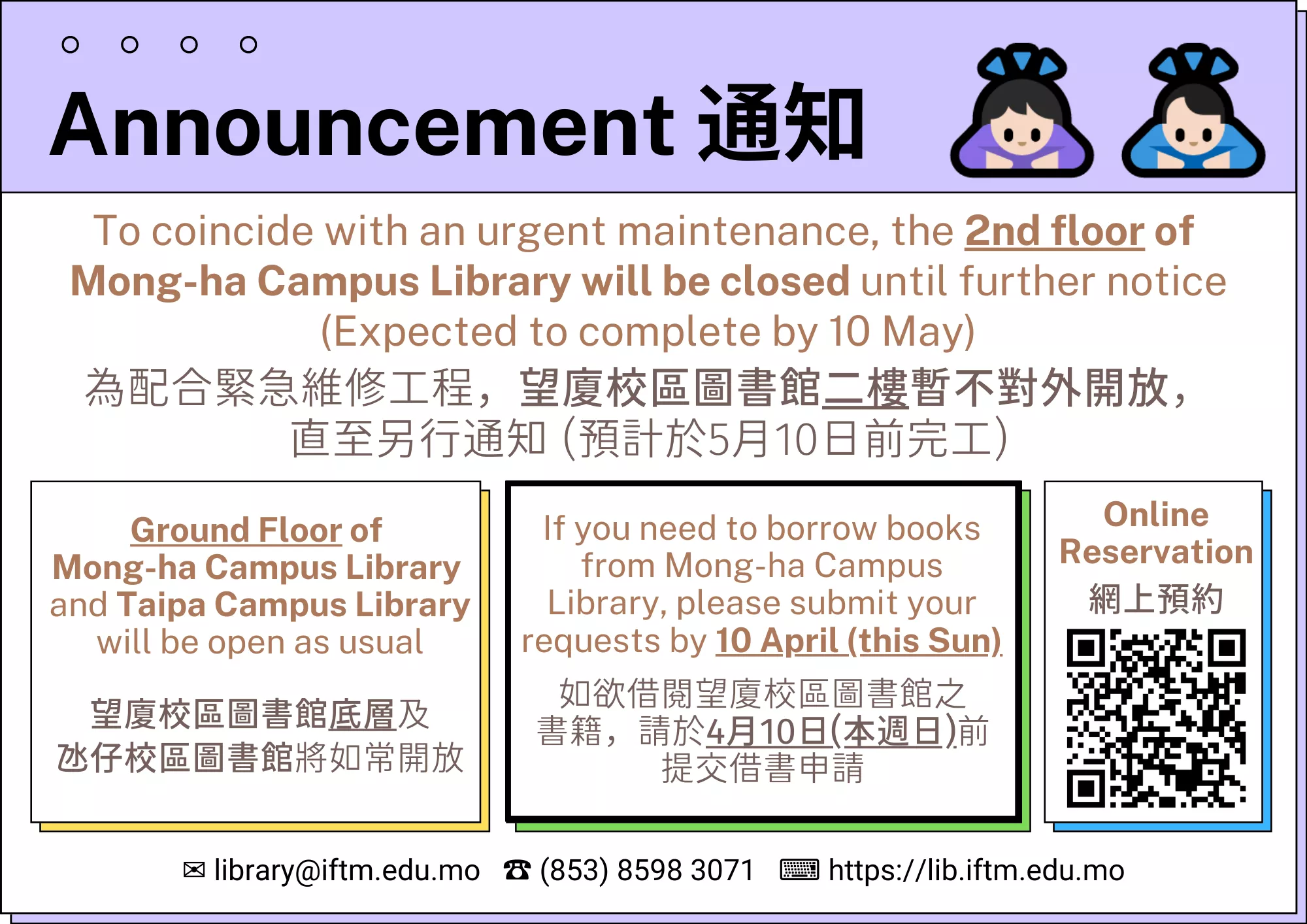 To ensure the safety of all our students and staff, the borrowing service of Mong-Ha Campus Library will be suspended from next week until the expected completion date of the urgent maintenance on 10th May.